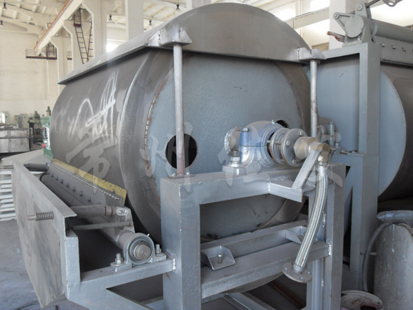 利用刮刀把產(chǎn)品刮下來(lái),露出滾筒表面再次與原料接觸形成薄膜進(jìn)行干燥。